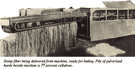 With the new machine -- known as a decorticator -- hemp is cut with a slightly modified grain binder. It is delivered to the machine where an automatic chain conveyor feeds it to the breaking arms at a rate of two or three tons per hour. The hurds are broken into fine pieces that drop into the hopper, from where they are delivered by blower to a baler, or to a truck or freight car for loose shipment. The fiber comes from the other end of the machine, ready for baling.