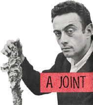 Author shown holding a part of a marijuana cigarette ![]() Derivation: many ingenious hiding places where pushers conceal their narcotics; knee joints, elbow joints. This term and place of concealment was exposed by a Royal Canadian Mountie who offered to Indian wrestle one of the pushers who was under surveillance and who, during the contest, was unable to keep his elbows down. They kept flying toward the ceiling |