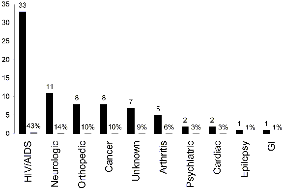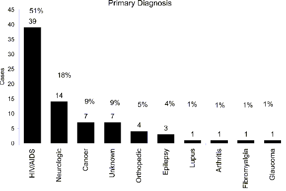 Thirty-nine patients (51 percent) had HIV/AIDS; 14 (18 percent) had neurological diseases, and 7 (9 percent) had a principle diagnosis of cancer.