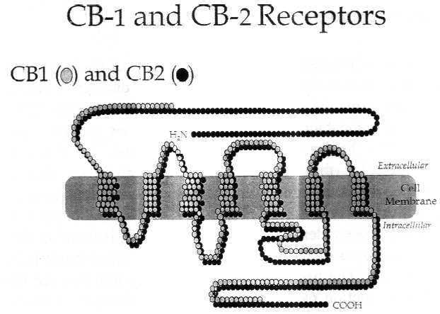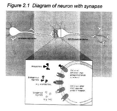metabolism in the liver, including increase in brain levels of THC and its major metabolites, most likely because of its effects on decreasing the clearance rate of THC from the body 15 In mice, THC inhibits the release of luteinizing hormone (LH), the pituitary hormone that triggers the release of testosterone from the testis in males, this effect is increased when THC is given together with cannabinol or CBD.113 Cannabinol is considerably less active than THC in the brain, but studies of immune cells have shown that it can modulate immune function (see section on Cannabinoids and the Immune System). In mice, cannabinol lowers body temperature and increases sleep duration.175 The Pharmacological Toolbox A researcher needs certain key tools in order to understand how a drug acts on the brain. To appreciate the importance of these tools, one must first understand some basic principles of drug action. All recent studies have indicated that the behavioral effects of THC are receptor-mediated.27 Neurons in the brain are activated when a compound binds to its receptor, which is a protein typically located on the cell surface. Thus, THC will exert its effects only after binding to its receptor. In general, a given receptor will accept only particular classes of compounds and will be unaffected by other compounds. Compounds that activate receptors are called agonists. Binding to a receptor triggers an event or a series of events in the cell that results in a change in the cell's activity, its gene regulation, or the signals that it sends to neighboring cells (figure 2. 1). This agonist-induced process is called signal transduction. Another tool for drug research, which only recently became available for cannabinoid research, are the receptor antagonists, so-called because they selectively bind to a receptor that would have otherwise been available for binding to some other compound or drug. Antagonists block the effects of agonists and are tools to identify receptor functions by showing what happens when a receptor's normal functions are blocked. Agonists and antagonists are both ligands; that is, they bind to receptors. Hormones, neurotransmitters, and drugs can all act as ligands. Morphine and naloxone provide a good example. A large dose of morphine acts as an agonist at opioid receptors in the brain and interferes with, or even arrests, breathing. Naloxone, a powerful opioid antagonist, blocks morphine's effects on opiate receptors, thereby allowing an overdose victim to resume breathing normally. Naloxone itself has no effect on breathing. Another key tool involves identifying the receptor protein and determining how it works. That makes it possible to locate where a drug activates its receptor in the brain -both the general region of the brain and the cell type where the receptor is. The way to find a receptor for a drug in the brain is to make the receptor "visible" by attaching a radioactive or fluorescent marker to the drug so that it can be detected. Such markers show where in the brain it binds to the receptor, but this is not necessarily the part of the brain where the drug ultimately has its greatest effects. Because drugs injected into animals must be dissolved in a water-based solution, it is easier to deliver water-soluble molecules than to deliver fat-soluble (lipophilic) molecules such as THC. THC is so lipophilic that it can stick to glass and plastic syringes used for injection. Because it is lipophilic, it readily enters cell membranes and thus can cross the blood brain barrier easily. (This barrier insulates the brain from many blood-borne substances.) Early cannabinoid research was hindered by the lack of potent cannabinoid ligands (THC binds to its cannabinoid receptors rather weakly) and because they were not readily water-soluble. The synthetic agonist, CP 55,940, which is more water-soluble than THC, became the first useful research tool for studying cannabinoid receptors because of its high potency, and the ability to label it with a radioactive molecule, which enabled researchers to trace its activity. Figure 2.1 Diagram of neuron with synapse ![]() How receptors work: Individual nerve cells, or neurons, both send and receive cellular signals to and from neighboring neurons, but for the purposes of this diagram only one activity is indicated for each cell. Neurotransmitter molecules (shown as black dots) are released from the neuron terminal and move across the gap between the "sending" and "receiving" neurons. A signal is transmitted to the receiving neuron when the neurotransmitters has bound to the receptor on its surface. The effects of a transmitted signal include: ·Changing the cell's permeability to ions such as calcium and potassium. Those effects can lead to cognitive, behavioral, or physiological changes, depending on which neuronal system is activated. The expanded view of the synapse illustrates a variety of ligands, that is, molecules that bind to receptors. Anandamide is a substance produced by the body that binds to and activates cannabinoid receptors; it is an endogenous agonist. THC can also bind to and activate cannabinoid receptors, but is not naturally found in the body; it is an exogenous agonist. SR141617A binds to, but does not activate cannabinoid receptors. In this way, it prevents agonists, such as anandamide and THC, from activating cannabinoid receptors by binding to the receptors without activating them; SR141617A is an antagonist, but it is not normally produced in the body. Endogenous antagonists, that is, those normally produced in the body, might also exist, but none have been identified. Cannabinoid Receptors The cannabinoid receptor is a typical member of the largest known family of receptors: the G-protein-coupled receptors with their distinctive pattern in which the receptor molecule spans the cell membrane seven times (figure 2.2). For excellent recent reviews of cannabinoid receptor biology, see Childers and Breivogel,27 Abood