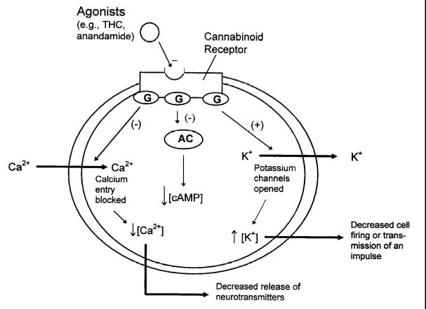 Other endogenous agonists Several other endogenous compounds that are chemically related to anandamide and that bind to cannabinoid receptors have been discovered, one of which is 2-AG.108 2-AG is closely related to anandamide and is even more abundant in the brain. At time of this writing, all known endogenous cannabinoid receptor agonists (including anandamide) are eicosanoids, which are arachidonic acid metabolites. Arachidonic acid (a free fatty acid) is released via hydrolysis of membrane phospholipids. Other, non-eicosanoid, compounds that bind cannabinoid receptors have recently been isolated from brain tissue, but they have not been identified, and their biological effects are under investigation. This is a fast-moving field of research, and no review over six months old can be fully up-to-date. The endogenous compounds that bind to cannabinoid receptors probably perform a broad range of natural functions in the brain. This neural signaling system is rich and complex, and has many subtle variations' many of which await discovery. In the next few years, much more will likely by known about these naturally occurring cannabinoids. Some effects of cannabinoid agonists are receptor-independent. For example, both THC and CBD can be neuroprotective through their antioxidative activity; that is, they can reduce the toxic forms of oxygen that are released when cells are under stress.54 Other likely examples of receptor-independent cannabinoid activity are modulation of activation of membrane-bound enzymes (e.g., ATPase), arachidonic acid release, and perturbation of membrane lipids. An important caution in interpreting those reports is that concentrations of THC or CBD used in cellular studies, such as these, are generally much higher than the concentrations of THC or CBD in the body that would likely be achieved by smoking marijuana. Novel targets for therapeutic drugs Drugs that alter the natural biology of anandamide, or other endogenous cannabinoids, might have therapeutic uses (table 2.4). For example, drugs that selectively inhibit neuronal uptake of anandamide would increase the brain's own natural cannabinoids and mimic some of the effects of THC. A number of important psychotherapeutic drugs act by inhibiting neurotransmitter uptake. For example, antidepressants like fluoxetine (Prozac®) inhibit serotonin uptake, and are known as selective serotonin re-uptake inhibitors, or SSRI's. Another way to alter levels of endogenous cannabinoids would be to develop drugs that act on the enzymes involved in anandamide synthesis. Some anti-hypertensive drugs work by inhibiting enzymes involved in the synthesis of endogenous hypertensive agents. Fore example, anti-converting enzyme (ACE) inhibitors are used in hypertensive patients to interfere with the conversion of angiotensin I, which is inactive, to the active hormone, angiotensin II Table 2.4. Cellular processes that can be targeted for drug development TABLE LEGEND. Endogenous cannabinoids are part of a cellular signaling system. This table lists categories of natural processes that regulate such systems, and shows the results of altering those processes.