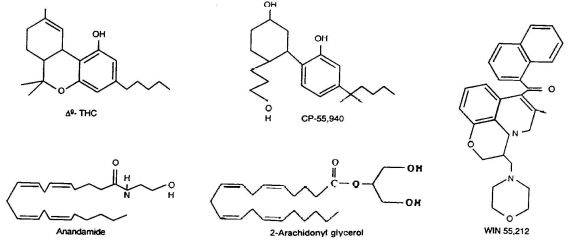 Figure 2.4 Chemical structures of compounds that bind to cannabinoid receptors ![]() Figure Legend. Selected cannabinoid agonists, or molecules that bind to and activate cannabinoid receptors. THC is the primary psychoactive molecule found in marijuana. CP 55,940 is a THC-analogue; that is, its chemical structure is related to THC. Anandamide and 2-arachidonyl glycerol (2-AG) are endogenous molecules, meaning they are naturally produced in the body. Although the chemical structure of WIN 55,212 is very different from either THC or anandamide, it is also a cannabinoid agonists. Table 2.3 Comparison of cannabinoid receptor agonists Potency can be measured in a variety of ways, from behavioral to physiological to cellular. This table shows potency in terms of receptor binding, which is the most broadly applicable to the many possible actions of cannabinoids. For example, anandamide binds to the cannabinoid receptor only about half as avidly as does THC. Measures of potency might include effects on activity (behavioral) or hypothermia (physiological). The apparently low potency of 2-AG may, however, be misleading. A study published late in 1998, reports that 2-AG is found with two other, closely related compounds that, by themselves, are biologically inactive, but in the presence of those two compounds, 2-AG is only three times less active than THC.9 Further, 2-AG is much more abundant than anandamide, although the biological significance of this remains to be determined.