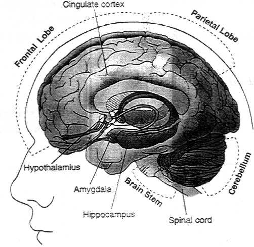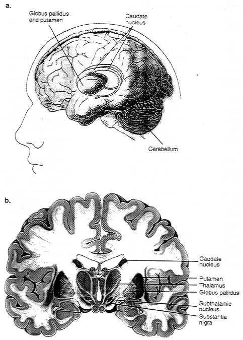 Sites of Action Cannabinoid receptors are particularly abundant in some areas of the brain. The normal biology and behavior associated with these brain areas are consistent with the behavioral effects produced by cannabinoids (table 2.5 and figure 2.5). The highest receptor density is found in cells of the basal ganglia that project locally and to other brain regions. These cells include the substantia nigra pars reticulata, entopeduncular nucleus, and globus pallidus, regions that are generally involved in coordinating body movements. Patients with Parkinson and Huntington disease tend to have impaired functions in these regions. CB1 receptors are also abundant in the putamen, part of the relay system within the basal ganglia that regulates body movements, the cerebellum, which coordinates body movements; the hippocampus, which is involved in learning, memory, and response to stress; and the cerebral cortex, which is concerned with the integration of higher cognitive functions. CB1 receptors are found on various parts of neurons, including the axon, cell bodies, terminals, and dendrites.57, 165 Dendrites are generally the "receiving" part of a neuron, and receptors on axons or cell bodies generally modulate other signals. Axon terminals are the "sending" part of the neuron. Cannabinoids