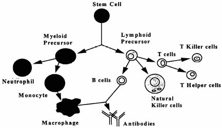 * cell density dependent; a Drug concentrations are given in the standard format of molarity (M). A one molar solution is the molecular weight of the compound (in grams) dissolved in 1 liter of water or other solvent. The molecular weight of THC is 314 so a 1 molar solution would be 314 grams of THC dissolved in 1 liter of solution, a 10 µM solution would be 3.14 mg THC/liter. A 1-10 µM concentration will generally elicit a physiologically relevant response in immune cell cultures. Higher doses are often suspected of not being biologically meaningful, because they are a much larger dose than would ever be achieved in the body. The doses listed in this table are, for the most part, very high. See text for further discussion. Cells of the Immune System The various organs of the immune system are positioned throughout the body and include bone marrow, thymus, lymph nodes and spleen. The cells of the immune system consist of white blood cells, or leukocytes, which are formed in the bone marrow from stem cells so-called because a great variety of cells descend from them (see below). There are two kinds of leukocytes: Lymphocytes and phagocytes. Lymphocytes consist of B cells, T cells,h and natural killer cells (NK), and the major phagocytes include monocytes, macrophages and neutrophils. Phagocytes have many important roles in the immune response, but most significantly they initiate these responses by engulfing and digesting foreign substances (e.g., bacteria, viruses, foreign proteins), or antigens, that enter the body. Once digested, the antigen is exposed to specialized Iymphocytes (i.e., B cells and T cells) so that antibodies and effector T cells can be produced to help destroy any remaining antigens in the body. Antibodies are proteins produced by B cells that bind to antigens and promote antigen destruction. effector T cells include killer T cells which attack and kill antigen laden cells, and helper T cells, which secrete special proteins called cytokines that promote antigen elimination. Natural killer cells are specialized Iymphocytes that are also activated by antigen to either kill infected targets or secrete immunoregulatory cytokines. ![]() h The B and T refer to where the cells mature, either in the bone marrow (B) or thymus (T). The CB2 receptor gene, which is not expressed in the brain, is particularly abundant in immune tissues, with an expression level 10-100 times higher than that of CB1 In spleen and tonsils, the CB2 mRNAi content is equivalent to that of CB1 mRNA in the brain.48 The rank order, from high to low, of CB2 mRNA levels in immune cells is B-cells > natural killer cells >> monocytes > polymorphonuclear neutrophil cells > T8 cells in T4 cells. In tonsils, the CB2 receptors appear to be restricted to B-lymphocyte-enriched areas. In contrast, CB1 receptors are mainly expressed in the central nervous system and, to a lower extent, in several peripheral tissues such as adrenal gland, heart, lung, prostate, uterus, ovary, testis, bone marrow, thymus and tonsils. Cannabinoid Receptors and Intracellular Action in Immune Cells CB2 appears to be the predominant gene expressed in resting leukocytes.78, 112 The level of CB1 gene activity is normally low in resting cells but increases with cell activation.32 Thus the CB1 receptor might be important only when immune responses are stimulated, but the physiological relevance of this observation remains to be determined. Some of the cannabinoid effects observed in immune systems, especially at high drug concentrations, are likely mediated through non-receptor mechanisms, but these have not yet been identified.4 Ligand binding to either the CB1 or CB2 receptors inhibits adenylate cyclase, an enzyme that is responsible for cAMP production, and is, thus, an integral aspect of intracellular signal transduction (see figure 2.3).53, 79, 91, 122, 139, 151, 167 Increases in intracellular cAMP concentrations lead to immune enhancement, while decreases lead to an inhibition of immune responses.77 Cannabinoids inhibit the rise in intracellular cAMP that normally results from leukocyte activation, and this might be the pathway through which cannabinoids suppress immune cell functions.28, 74, 167 In addition, cannabinoids activate other molecular pathways such as the nuclear factor-kB pathway and therefore these signals might be modified in drug treated immune cells.33, 74 i After a gene is transcribed it is often spliced and modified into mRNA, or message RNA. The CB-2 mRNA is the gene "message" that moves from the cell nucleus into the cytoplasm where it will be translated into the receptor protein. T and B Cells When stimulated by antigen, lymphocytes (see box on Cells of the Immune System) first proliferate and then mature or differentiate to become potent effector cells, such as B cells that release antibodies or T cells that release cytokines. The normal T cell proliferation that is seen when human lymphocytes and mouse splenocytes (spleen cells) are exposed to antigens and mitogensj can be inhibited by THC, 11-OH-THC, cannabinol, and 2-AG, as well as synthetic cannabinoid agonists such as CP 55,940, WIN 55,212 and HU-210 61, 89, 93, 99, 127, 155 In contrast, one study testing anandamide revealed little or no effect on T-cell proliferation.93 However, these drug effects are variable, and depend on experimental conditions such as the experimental drug dose used, mitogen used, percent of serum in the culture, and timing of cannabinoid drug exposure. In general, lower doses of cannabinoids increase proliferation while higher doses suppress proliferation. Doses that are effective in suppressing immune function are typically greater than 10 µM in cell culture studies and greater than 5 mg/kg in whole animal studies.85 By comparison, at 0.05 mg/kg, people will experience the full psychoactive effects of THC; however, because of their high metabolic rates, small rodents frequently require drug doses that are 100-fold higher than doses ne