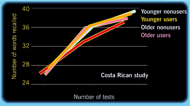 Other research suggests that evidence of dramatic mental decline is unlikely to be found, even as a result of long-term heavy use. Over the past 25 years, Jack Fletcher at the University of Texas in Houston and his colleagues have been visiting Costa Rica to test the mental skills of very heavy users. Although some of them have smoked 10 joints a day for more than 30 years, their ability to learn and remember lists of words is only mildly impaired (see diagram below). And even when struggling with more demanding tasks, such as recalling information while pressing a tapper as fast as possible, their scores fall well within the normal range.